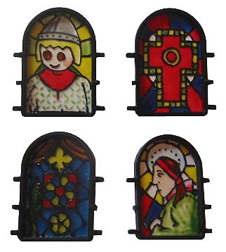 There are four hand made stained glass windows in the church. Each is attached to a standard Playmobil castle window frame and can be slotted into any castle window.